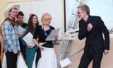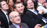 The celebration began with the opening of an exhibition “EUSP-15” prepared by the Student Council. The various displays telling about the history of the University from the very beginning were presented. The official part started with traditional announcement warning of a fire and the evacuation of the building, after which the participants in the action ceremonially carried the fire hose into the conference hall. Three successive Rectors of the University – Boris Firsov, Nikolay Vakhtin and Oleg Kharkhordin shared their views on experience gained during 15 years of existence and future development plans. Alumni representatives living and working in different countries but still maintaining close links with the University also addressed the warm words towards EUSP. At the end students presented theatrical performance about the University life. The official part of the ceremony ended with the presentation of crystal snails to the employees, instructors, graduates, and students of the university who had distinguished themselves the most and a group photo of all the guests taken for the first time at the front staircase.